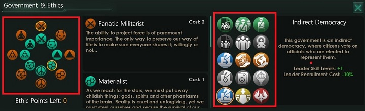 The screenshot presents two elements of the section. The first one refers to symbols of different ethics. Icons can be orange or green. Orange ones symbolize radical approach, while green ones, liberal. Your government can be established by choosing three liberal ethics or one radical.
