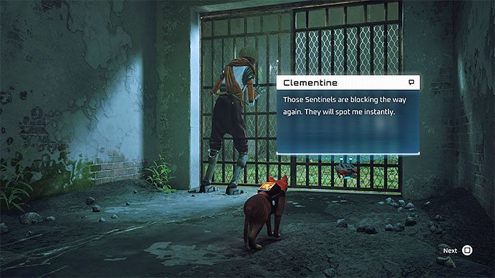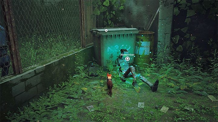 Before you go further (by heading through the gate opened by Clementine), check the far right corner of the square, which was guarded by the Sentinel. You will find a memory in the form of an inactive robot based on a garbage can.