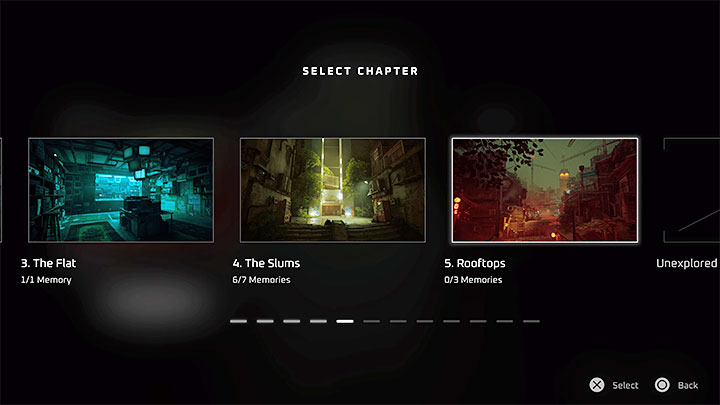 The select chapter option in the main menu helps you track your progress. You can find out how many Memories you have already discovered and how many are still waiting to be unlocked. Repeating the chapters allows you to look for the secrets you missed without restarting the entire game.