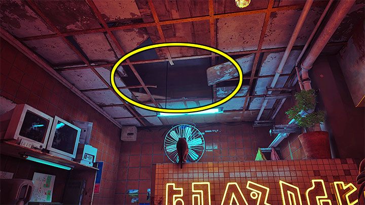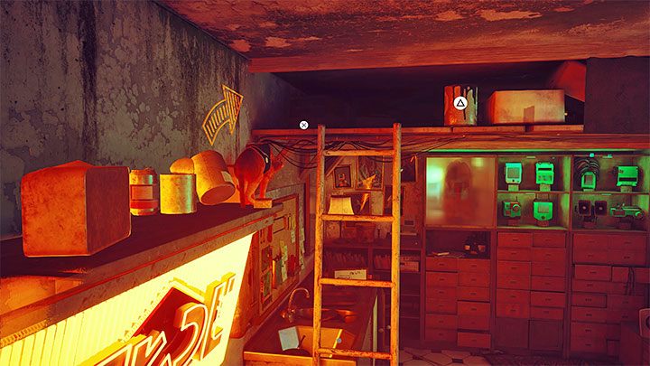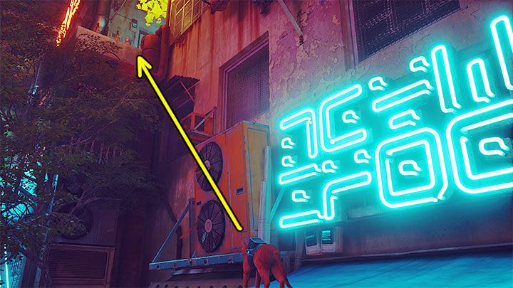 Start climbing the ledges and objects on the opposite side of the nightclub. Next to the blue neon sign from the screenshot, you will have to climb to the highest ledge.