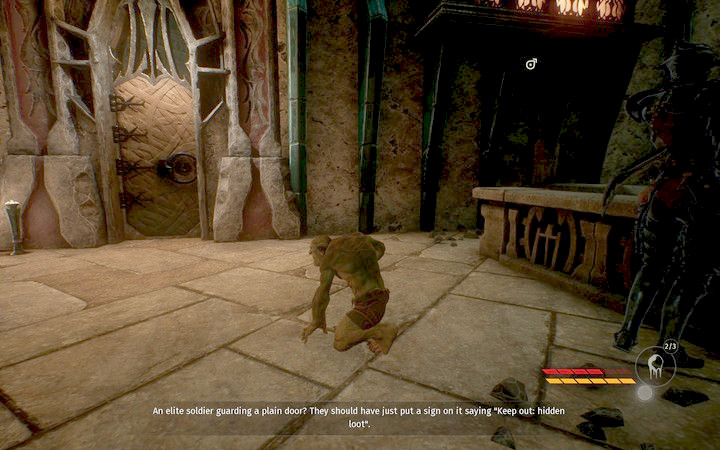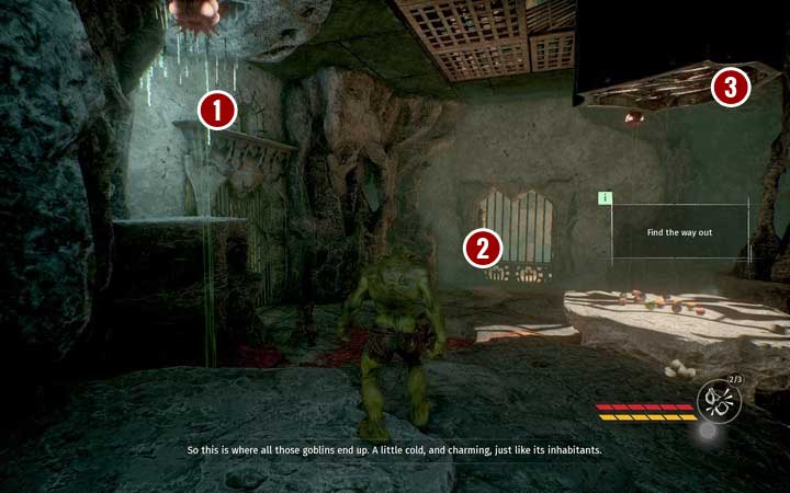 Additionally, once you've used the small passageway (marked with (1)) you can use a lever next to the gate that will release other goblins and create a bit of commotion to make things easier for you.
