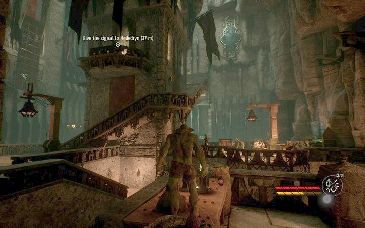 You'll find a lever that activates the alarm bell. Use it to create a small commotion and force the guards leave their posts. Then, hide below the table so the guard passes you by without resorting to combat. When the guard had left the room, jump on the pillar with the activated lever to get to the upper floor. You'll be able to access the beams supporting the bridge.