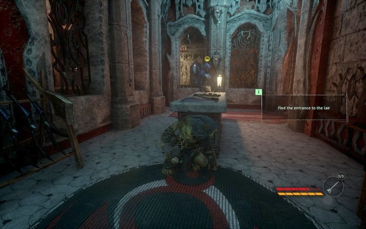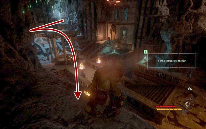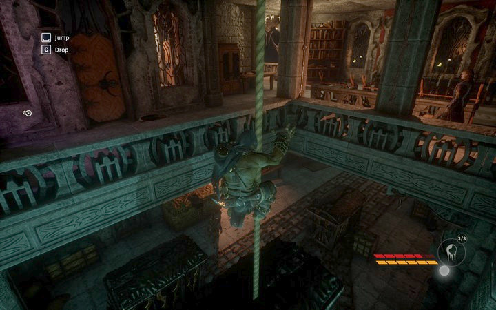 Making sure that you were not seen by the guard on the right side at the bottom, using perfectly suspended ropes and pieces of rock you will get straight to the designated point by the hearth. Go to the second indicator in the window and watch the monster through a crack. Then turn right, and you will go out into a corridor outside the gate. Now go to its end and descend to the lower level.