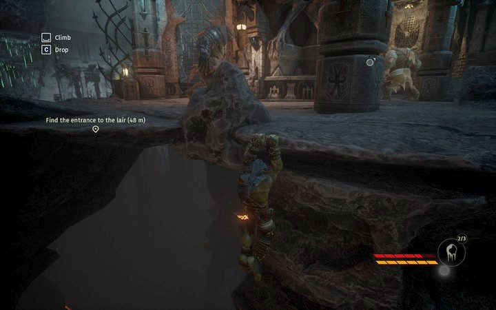 When you leave, the last stage will be waiting for you - 2 large trolls. They are distinguished by their ability to move in to attack much faster, when they manage to see you, even in the distance. Of course, they will also kill you immediately. Theoretically, you can hide from them by hanging from the edge of the rocks, but watch out for flying insects beneath you. You have to get to the second gate, because only there you can find the switch that opens it.