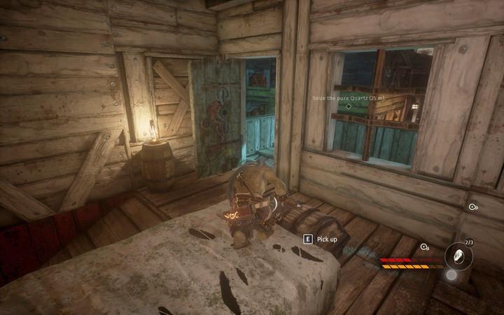 The fifth collectible is in a small bedroom (white walls) atop the stairs opposite the building with quartz (side mission marker).