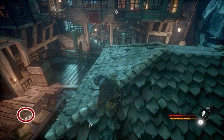 The fourth collectible is on the square behind the abovementioned balcony. There is a small red house there, overlooking a chasm, locked - use a lockpick or take the small passage.
