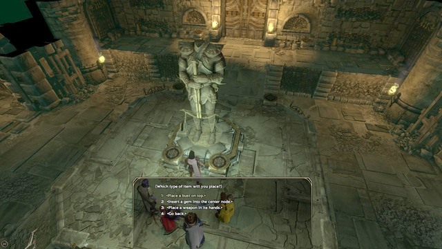 To leave the prison, you must first solve another puzzle. Approach the statue (M9, 16) shown on the above screenshot and interact with it. The statue will randomly present various heroes: a Wizard, a Fighter, or a Rogue. Your task is to assemble three elements that match with those three characters. The first one is the gem, the second one is the weapon, and the third one is the bust. Sets for each character are as follows: