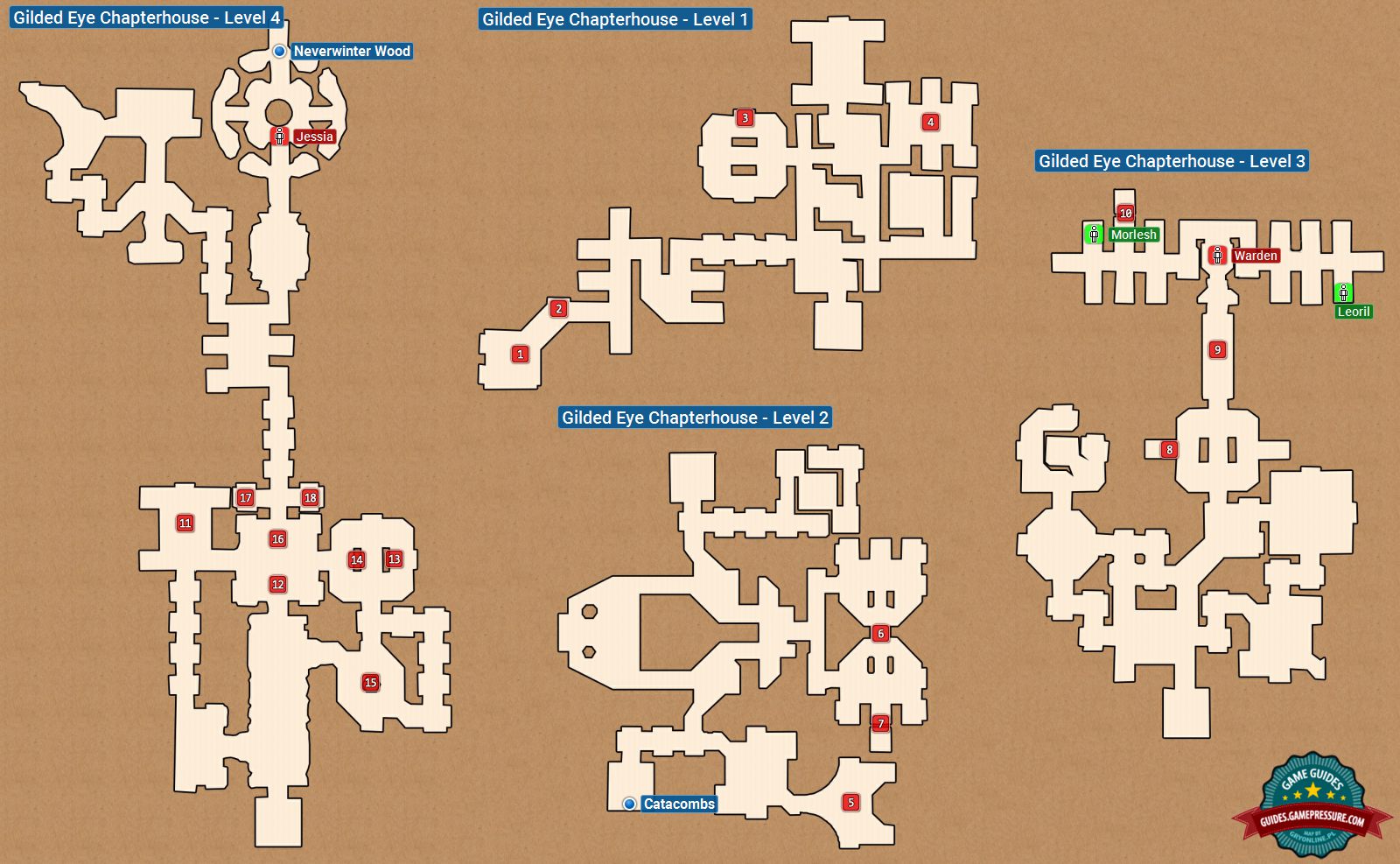Gilded Eye Chapterhouse is the main location of the enemy guild. You can get inside from the Neverwinter Woods, by using one of the three methods. The most effective way of exploring this area is to acquire the builder's journal and to use the secret passage leading to the Gilded Eye. The journal can be found in the Bear Dean. While exploring the Javen's room, the leader of the Gilded Eye, search his chest, where a key required to open the door leading to the prison can be found.