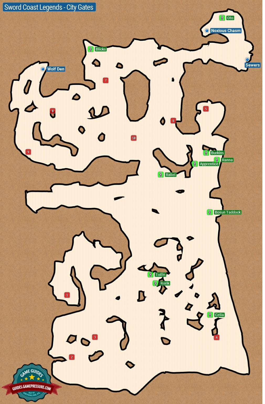 City Gates is the third main location which contains few activities available for the players. The location itself is just an introduction to the main city of Luskan. In this location you will find three dungeons. These dungeons are Sewers, the main dungeon where you will complete the Making an Entrance quest, Wolf Den related to the Howl at the Moon (available from Ranna) and Making an Entrance quests and Noxious Chasm in which you can complete the Fine Specimen quest (available in the Market District from Relona).