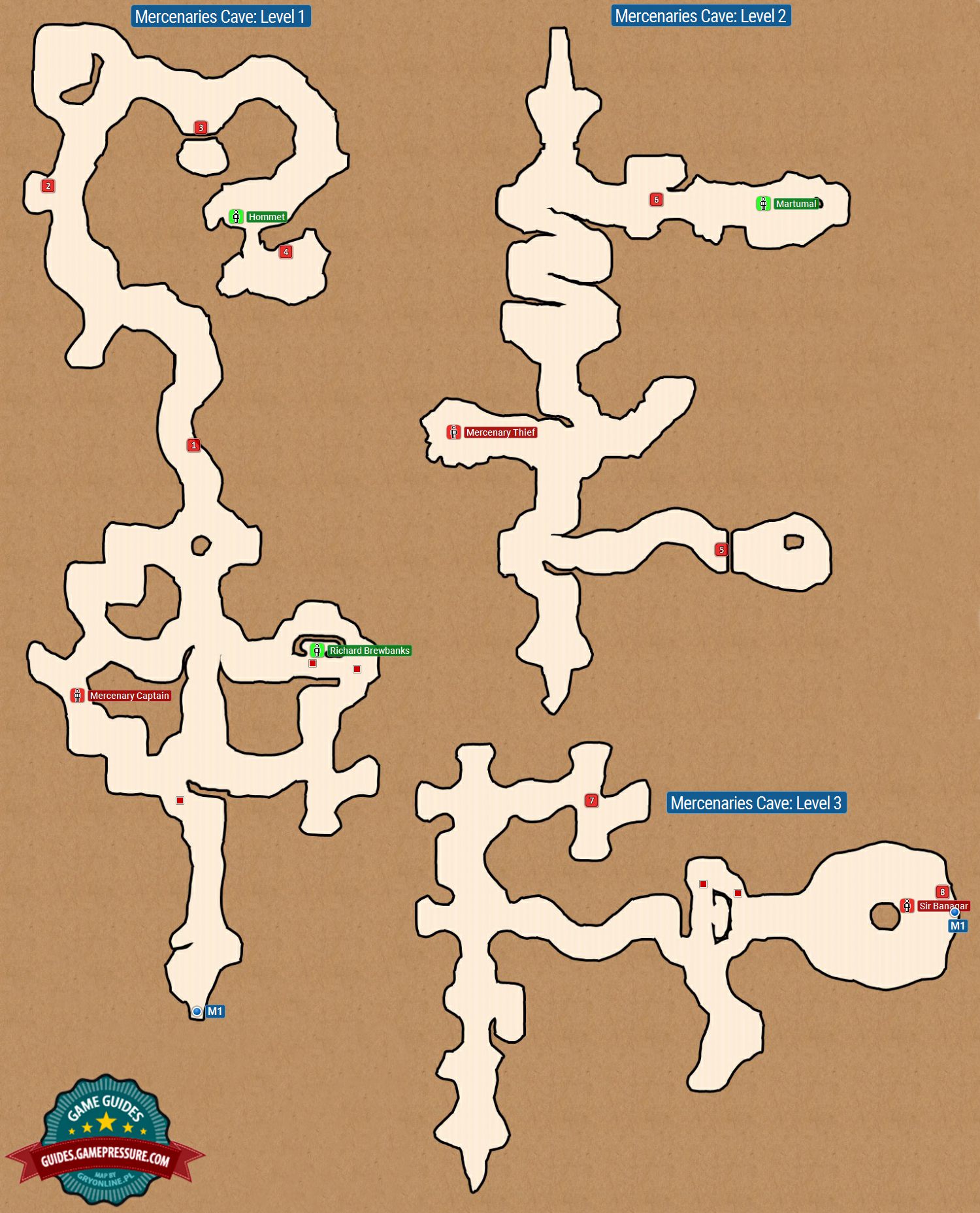 Mercenaries Cave is the main dungeon of The High Road location. Here you will complete the After Them! main quest. In this location you will also complete such side quests as The Twin Crest (available in The High Road at Wilfred), A Shady Deal (available in The High Road at Burkins) and Wayward Trader (available in The High Road at Tollin). You will find many traps in the dungeon. It is easy to disarm them with the search ability. As for the opponents, be especially careful when fighting the Mercenaries Captain, the leader of goblins Trax and Sir Banagar the knight. The location contains few hidden secret passages. You can find them with the search ability. Behind each such secret passage you will find a chest with useful equipment. On the second level of the caves you will find a potential party member. Hommet is standing at the entrance to the third cave level. On the second level of the caves (M2,6) you will find a secret passage that leads to Martumal (needed for completing the Wayward Trader quest). In order to open the passage, you must position three party members at the mechanisms next to the entrance. Use the "stop" command so that they remain at the assigned positions.
