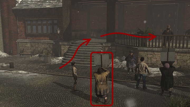 Go up the stairs to reach the platform, where the mayor is standing. Talk to him. If you want Kate's mission to finish successfully (and to simultaneously gain the Lobbyist achievement), pick the dialogue options, which will not antagonize Buliakin (3, 3, 3, 1, 3). Truth be told, in both cases our hero will need to perform the same task, but when granted the mayor's permission, she will gain certain aids - the supervisory commissar's note.