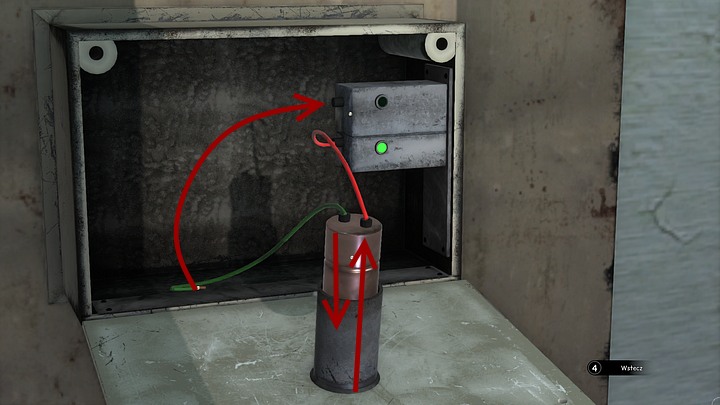 After opening the box, you will notice that the green wire is not connected. Klick the loose end of it and attach it to the fuse box by holding LMB - the green diode has to light up. Now grab the upper section of the battery and slide it down into the sleeve with mouse. Then close the sleeve by holding LMB and moving the cursor upwards. Then press the glowing red button to open the door - Kate will automatically leave the room (achievement: End of holiday).