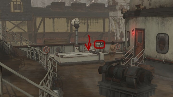 Leave the bridge and the quarterdeck - the best way is to use the door near the stairs that leads to the ferry. On this side of the deck you can find the wheel that opens the hatch to the hold - right next to where you can leave the ship. Turn the wheel right (make the correct move with the mouse) so both parts (left and right) of the hatch will go up. Go on the dock.