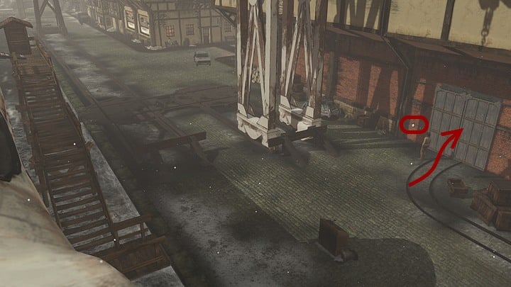 For now you shouldn't touch the lever coming out from the ground - it should be facing right. Take the drainpipe lying on the pallet in front of you. Also, take the rod leaning against the box on the left.
