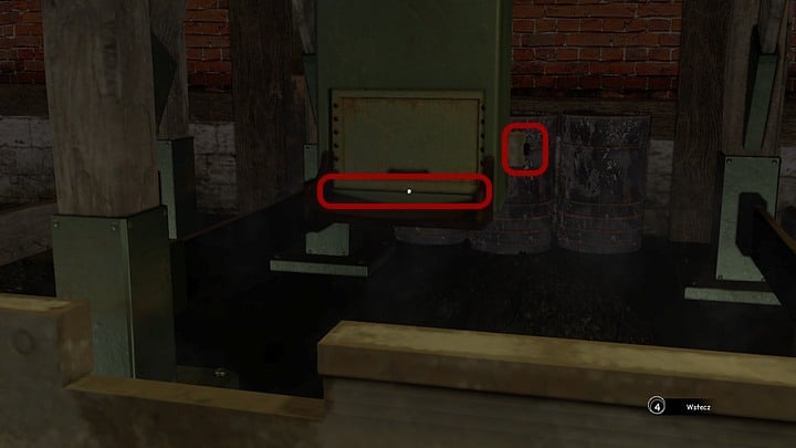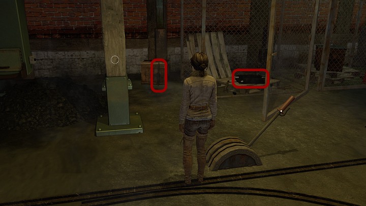 Go left - notice the green coal chutes located near the walls, on both sides of the room. Hit them with the rod in order to check which are full and which are empty. When you hit an empty chute, you can hear a more metallic sound while hitting a full chute gives a hollow sound - you can hear it when you hit the second (when facing the weird green vehicle) chute on the right.