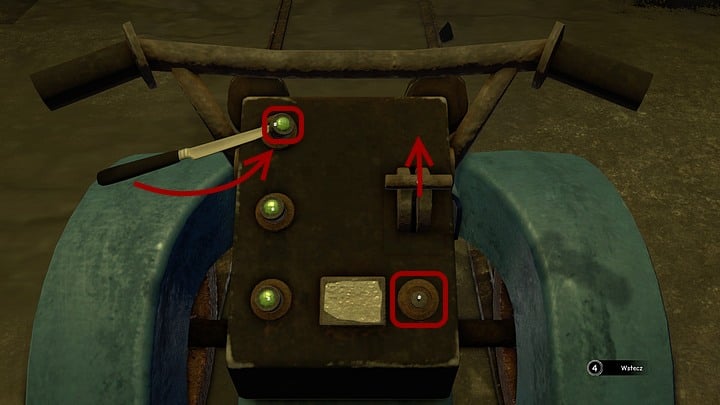 Now, the cart is too heavy to move it just by your hands - you must use the green vehicle standing near the wall (behind the cart). When Kate sits on it and you get to see its "dashboard" it turns out that the bottom right button is missing. Without it the vehicle won't move.