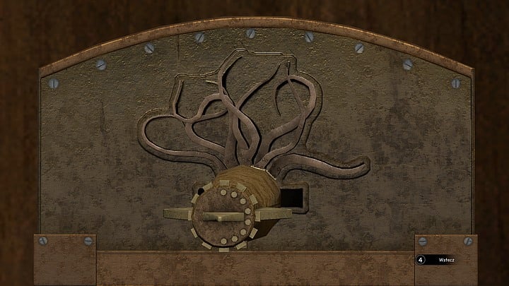 Proceed left until you reach dark-brown door embellished with some metal ornaments (left from the squatting patient). While you are zooming in you must open your inventory and use the key you just got from the doctor. The entrance key is rather unusual - nevertheless, use it on the lock on the left. Then, in another zoom, click the gear icon on the active spot in the middle of the key. A puzzle will appear.