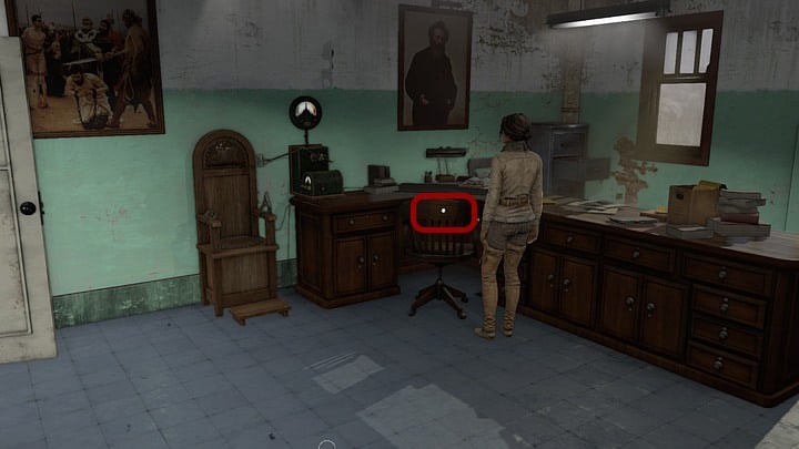 Exit the zoom and go to the Doctor's office. Check out his desk (interactive spot on the chair) that's standing on the right of the polygraph. When you zoom in on the drawer, click the items on the right and drag to the left, until you will spot the brochure with a red building on its cover. Take it and skim it through - you will see a drawing of the key. Click the interactive spot in the top of the key, and when the equipment appears, interact the key with the drawing from the book.