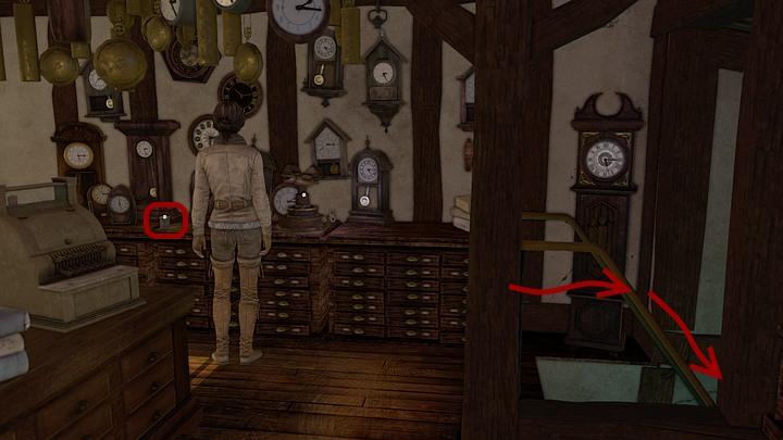 Take a look at the house-shaped clock hanging opposite to the counter (on the right side of the stairs). Enter a close-up of the clock and place the previously found cup on the base of the clock. Pull back the glass guarding the face of the clock and move the hands to an hour that was suggested by the note left by Steiner's granddaughter. The note says that the medicine should be taken (and is delivered) 3 hours before dinner. As we know, the man eats his dinner at 20, so switch the hour to 17 (place the large hand on 12, and small hand on 5) which will unlock the compartments that store the medicine. Once the cup is supplied with both the pills and the liquid, take the cup from the base of the clock and bring it to Steiner.