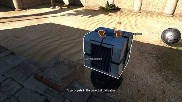Take two hexahedrons and transport them to the other side using the metal balls. Place the hexahedron on the ball and jump on it. While being above, take the second hexahedron and place it on the next ball until you get to safety.