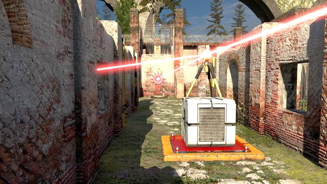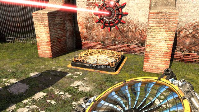 Get behind the gate and use the connector to direct the beam through a small window into another connector behind the wall. Each of the connectors has to be connected to each of the transmitters but to one button. If the button won't load, correct the alignment of the balls. Step onto the fan which will elevate you onto the platform with the lever.