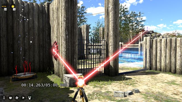 The final star is in the Colliding Beams puzzle. As soon as you complete the puzzle, you notice that the star is next to the switch, past the gate. The pressure plate that disables it is at the other side, over the steel fence. You need something to place onto it.