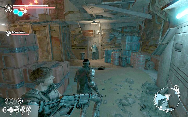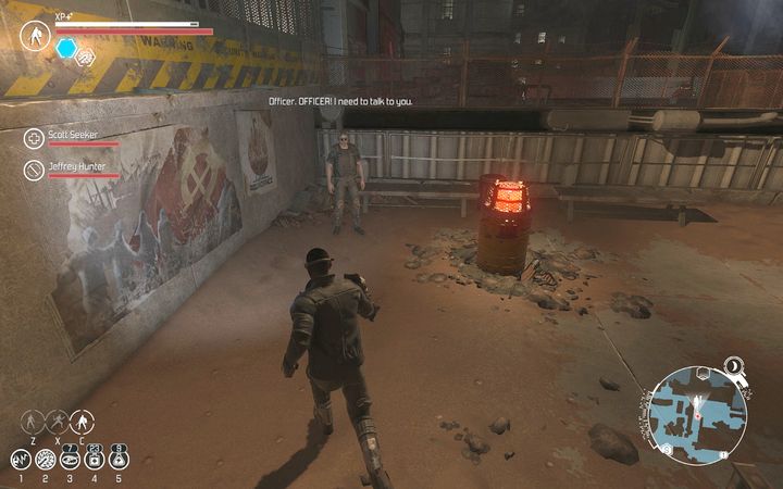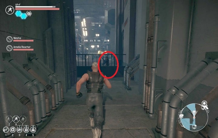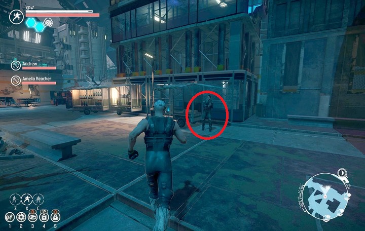 In the bar you will be interrupted by a woman wearing a helmet. She will ask you to help her find a certain man. After the conversation head to the upper floor and speak with the Eliter Soldier located in the middle of the room. Afterwards, get to the lower floor and speak with the man located near the exit of the bar.