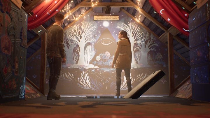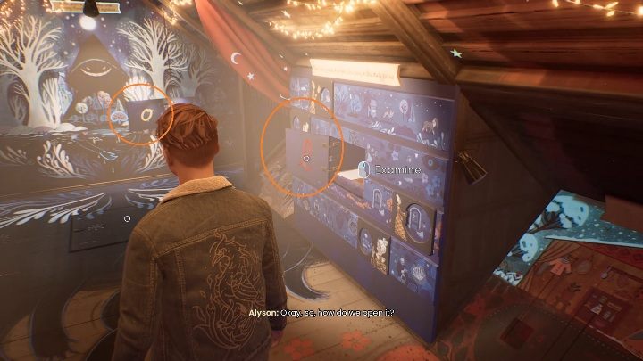 You'll find a box upstairs. To access it, you need to solve three puzzles. Let's start with the one found on the main attic wall.