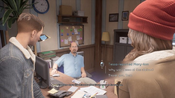 While talking to Tom, you can ask where Tessa is, why she reported the siblings' mother, and what she was doing at the police station at night. Once you have all the information, leave the office.