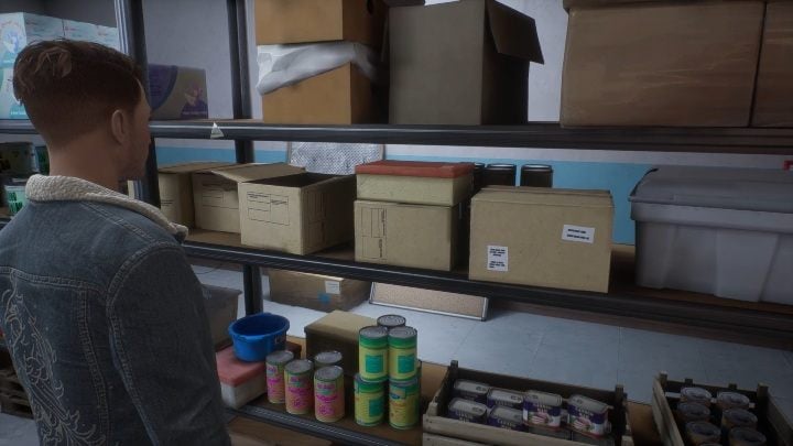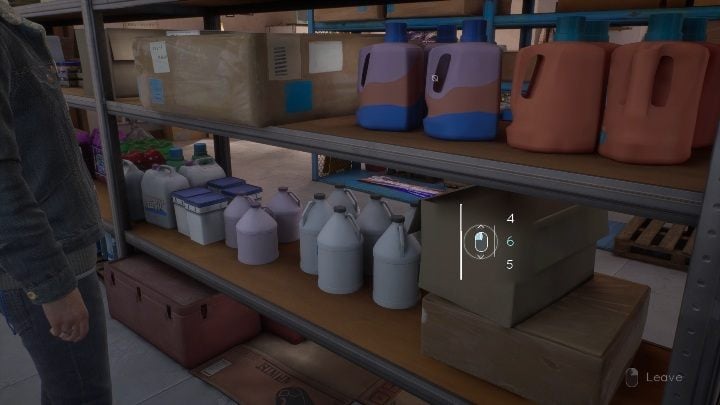 The next task is to count the bleach. They're on the shelf on the left. Exactly 6 bottles, which you can give to your friend straight away.