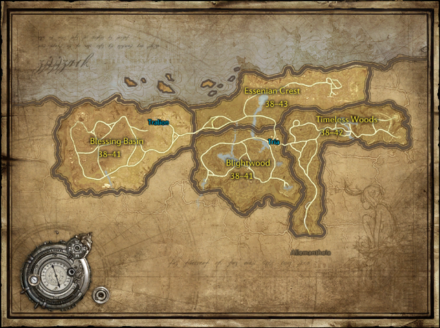 Areas to visit : Essenian Crest, Blightwood, Timeless Woods and Blessing Basin