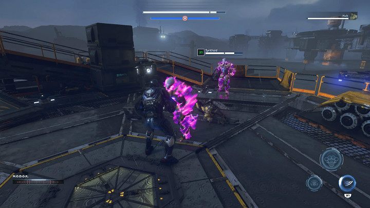 When Thor and Tony manage to destroy all the generators, MODOK will realize that his headquarters has been attacked. He will then send special types of Synthoids with a purple glow - they are remotely controlled by the supervillain.