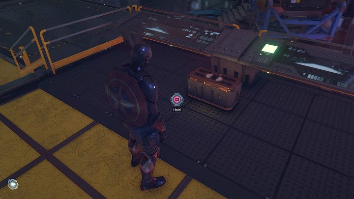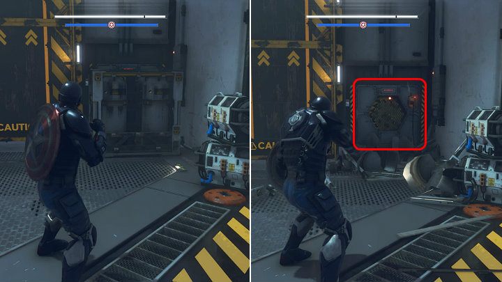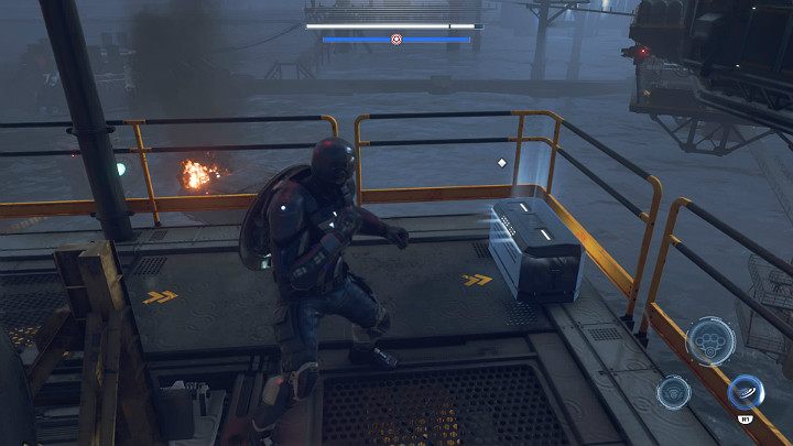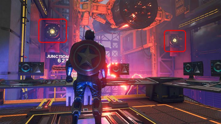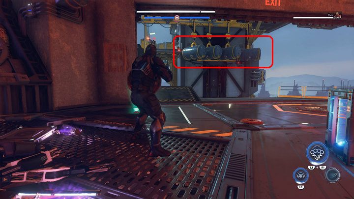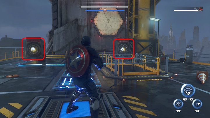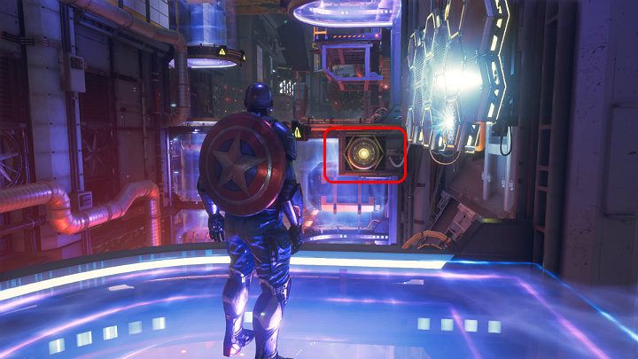 Stand on the button in the ground to reveal two buttons on the opposite wall - throw the shield at them. Continue along the metal structure and use the launching pad to break through the glass wall. Keep running and, with the help of another launching pad, fly to the upper floor of the tower.