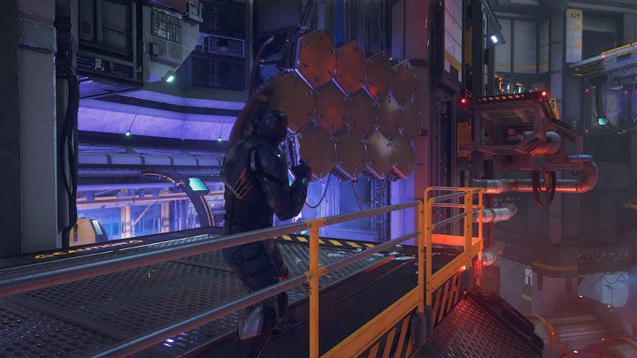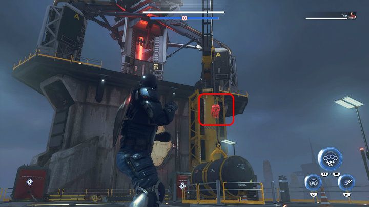 Note that the wall on the left side is electrified and the next floor is really high up. To jump higher you will first have to throw the shield at the two buttons shown in the image above. They are obscured by moving containers so you have to throw the shield at the right moment.
