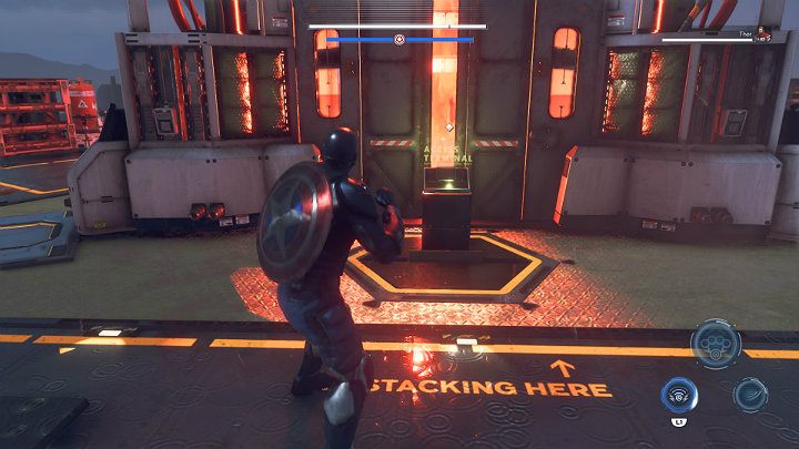 After the fight is over, activate the two buttons highlighted in the image above to deactivate the force field blocking access to the fortress. Now you have to wait for Natasha to hack into AIM's systems and let you in.