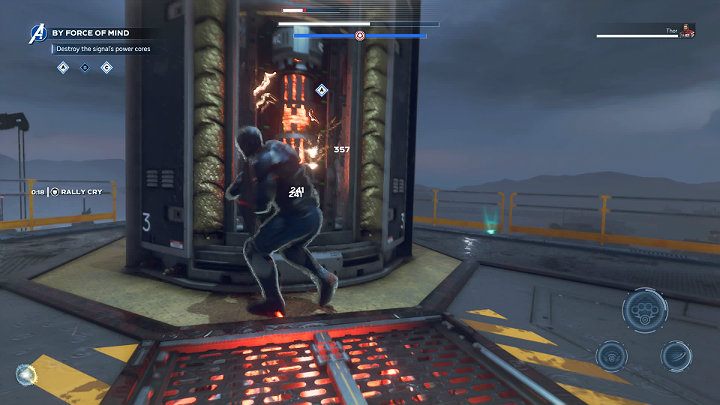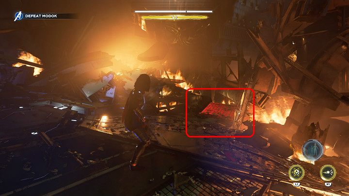 After some time, MODOK will fly up again. You have to attack the engine to knock down the opponent and then attack the power source. Repeat these steps about two more times to completely destroy the power source and proceed to the next phase.