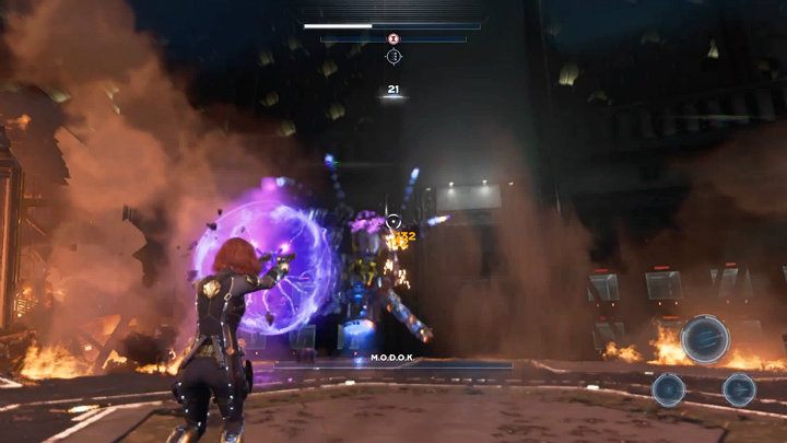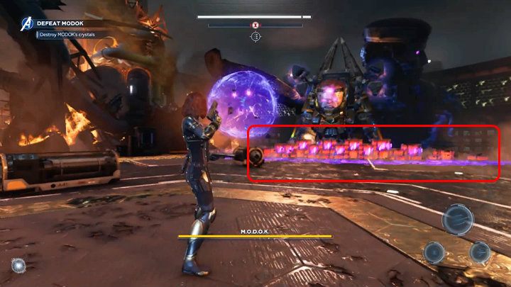 You now fight as Black Widow and your task is to destroy MODOK's crystals. Prepare for a test of your shooting abilities, because you can only rely on a range weapon during this fight.