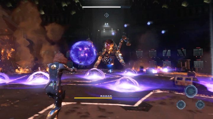 MODOK's attacks are strongly telegraphed. Pay attention to the red marker above his head and the red outline around his mechanical arm - it is about to fire in the direction of your hero.