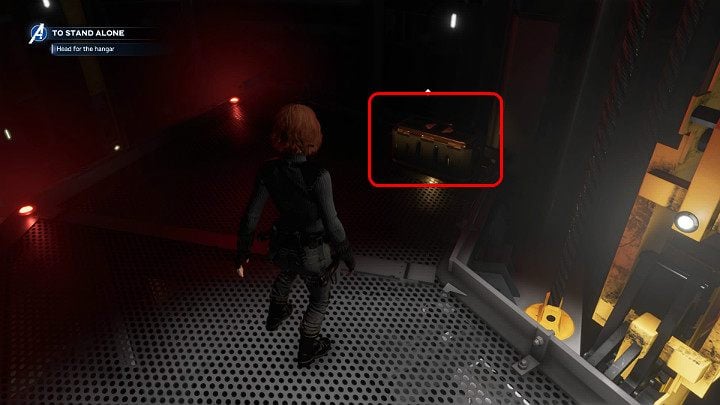 When you land on a small metal platform, make sure you've collected the chest, which can be found in a dark spot on the left. Go to the main mission objective marker.