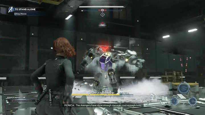 When two more Adaptoids appear in the hangar, you will have to complete a short tutorial that explains how you can use another heroic ability of Black Widow - the Power Surge skill. With special strikes that cause major shock damage, you should deal with your opponent efficiently. However, remember to perform dodges and counterattacks.