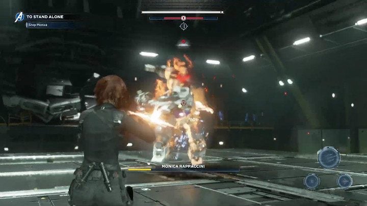 If you get very close to your target during the battle, Monica may try to attack you with her area of effect abilities. When a red marker appears above her head and raises her left arm of the exoskeleton, a red circle will appear on the ground - it is a sign that an impact is about to occur. Don't stand in the dangerous area.