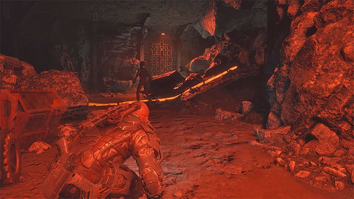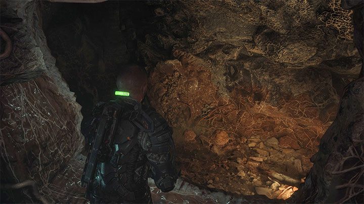 You can either stay on the main path or make a detour into a side tunnel - there is a collectible at the end of it. Eliminate or avoid next monsters and go between the rocks.