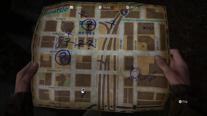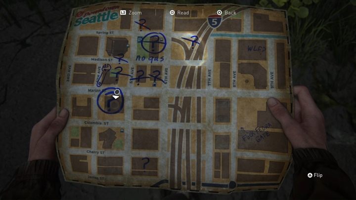 Downtown, Seattle Day 1, Ellie: walkthrough and detailed description. Court, Ration Distribution Center, map. Search for fuel. Spoiler free!