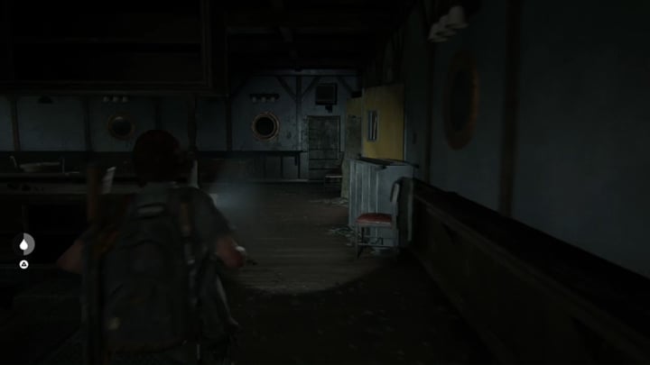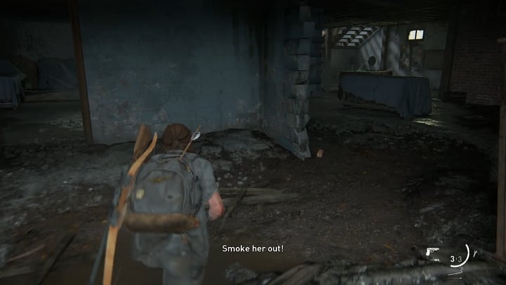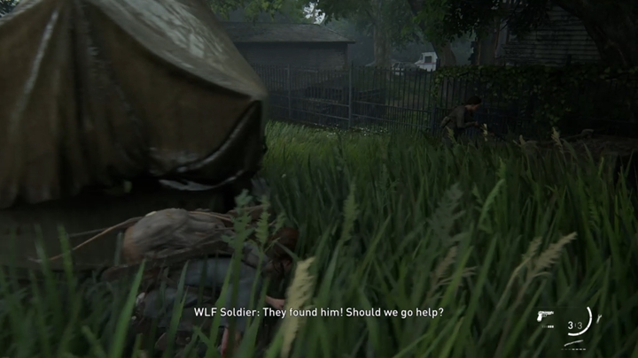 You will reach an area patrolled by a wolf squad. What's new is that one of the soldiers has a dog that can, e.g. smell you. When you activate Ellie's sight mode, you will see a scent trail - when a dog comes across your scent, you will need to change position quickly. You can, for example, enter the water to remove the smell.