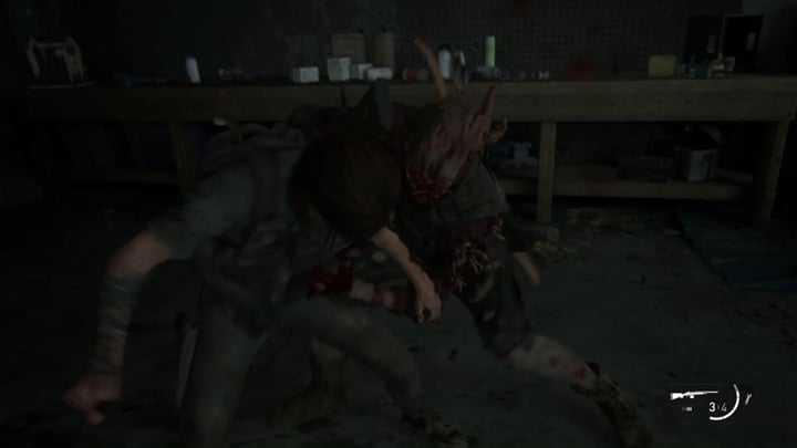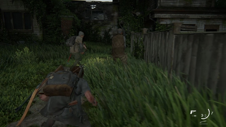 You come across Jesse, who has set out to help Ellie and Dina. Come out of hiding and hide near Jesse. When the boy runs to kill one of the guards, follow him and quickly kill the other guard. Now, wait for the next two to start searching, sneak behind their backs, and again, kill them together with Jesse.