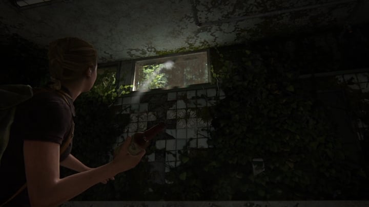 Move forward and try to find Abby's father. Enter the building next to the fence. Inside, a rat will knock a bucket and a bottle will fall out of it. Pick it up and aim at the window at the top - break it and go outside through it.