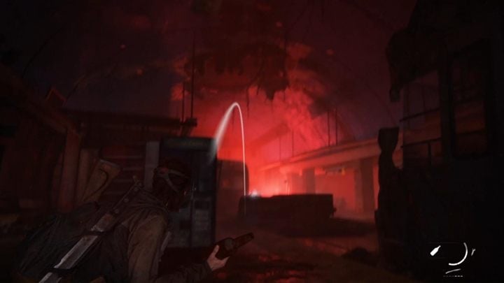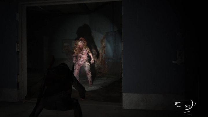 Crawl forward and you'll notice that one of the mutants explodes underneath you and kills a Wolf soldier. Find a hole in the glass and jump down. You will encounter an enemy resembling a Bloater, a very dangerous opponent known from the first part of the The Last of Us. This time the enemy is known as the Shambler and is even stronger and more dangerous than his earlier variation. A shotgun and a Molotov cocktail are great weapons against this type of enemy. Also, keep a safe distance from the opponent. The enemy explodes with gas that hurts Ellie, so you have to be careful and watch out for his attacks. Melee combat is useless as you will fall victim of the toxic gases of your enemy. Hide behind obstacles and use, for example, mines that can inflict a lot of damage on the mutant. Also, there will be one runner and an extra shambler to defeat during this battle, so plan it all well and monitor your ammo reserves.
