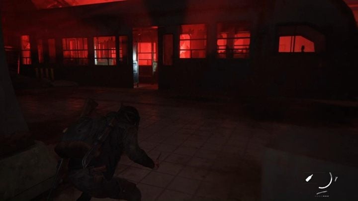 A little further you will reach the station where the red light is illuminating. Both the infected (clickers and runners) and the Wolves are wandering there. This sequence can be completed in several ways. One option is to throw a bottle around a group of people that will lure the mutants towards them. Then you can try to pass unnoticed, wait for the outcome of the fight (finish off the survivors).
