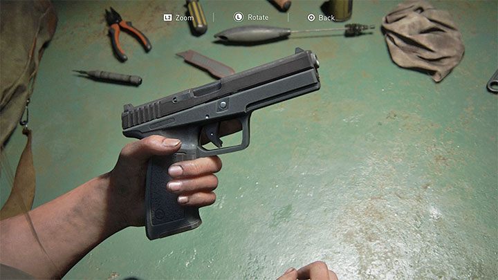 This is Ellie's primary weapon - she has it from the very beginning of the game. The pistol doesn't inflict heavy damage - aim at the heads of opponents. It is also the only gun (not counting the submachine gun from Santa Barbara) on which you can install a silencer. Use a silencer to kill enemies quietly and remove it during a direct confrontation.