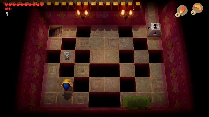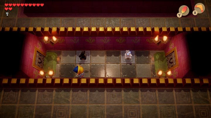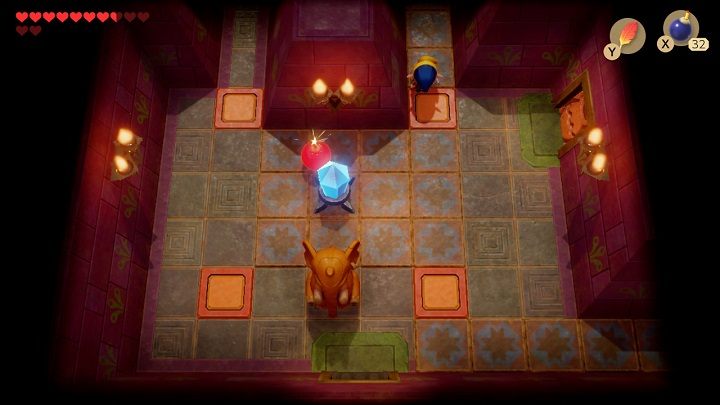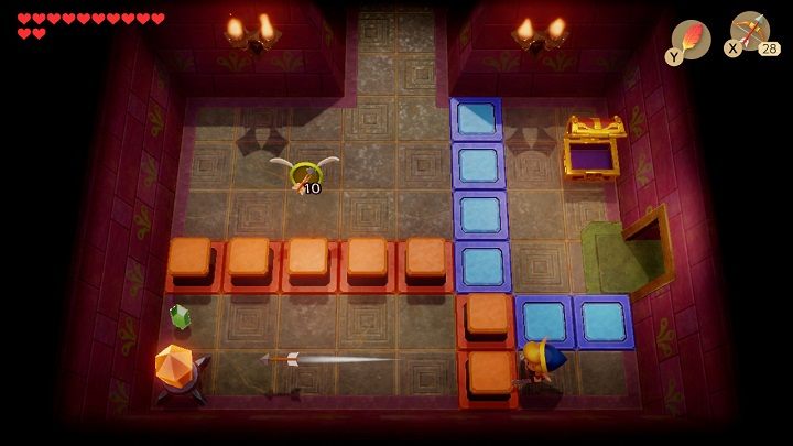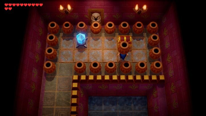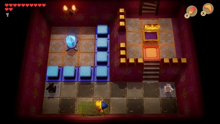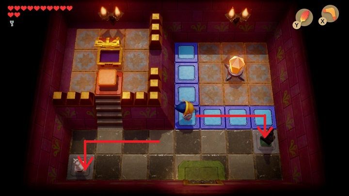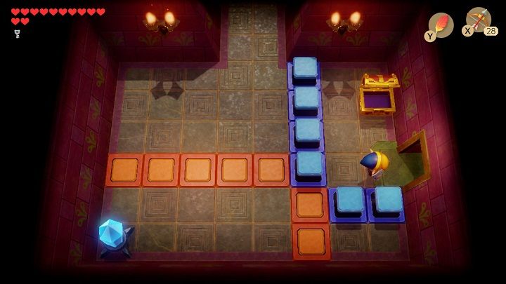 After entering the room, the door will slam behind you. First, you need to stand in front of the blue bricks on the floor and throw the boomerang at the crystal. Take 300 rupees from the chest. Stand in front of the blue brick on the floor again and hit the crystal with your boomerang so it turns orange. Remove the vase in the lower-left corner of the chamber. Underneath it is a place where you must throw a chess horse. Throw the chess horses on the grey bricks to open the door. Before leaving the room, throw the boomerang at the crystal so that it turns blue.